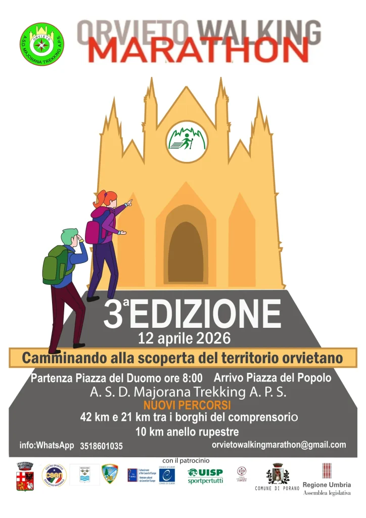 Orvieto Walking Marathon organizza camminate non competitive nel territorio orvietano. Orvieto, adagiata su uno sperone di tufo, nel cuore dell’Umbria, è un luogo del buon vivere secondo stili di vita lenti, in equilibrio con la natura. Qui con una sola passeggiata ti puoi immergere in un viaggio nel tempo, nell’arte, nell’enogastronomia. Da importante centro etrusco a fiorente città papale, dallo splendore del libero comune medievale alla modernità, millenni di civiltà si manifestano e concretizzano ad ogni passo: l’incanto del Duomo con la facciata dorata del Maitani ed i coinvolgenti e originalissimi affreschi del Signorelli; l’ingegno del Sangallo nelle elicoidali scale del pozzo di San Patrizio; la maestosità del medievale Palazzo del Popolo o dell’ottocentesco Teatro Mancinelli; dall’alto della Torre del Moro alle profondità della città sotterranea, dai pittoreschi ed intimi vicoletti alla caratteristica funicolare, dai colori delle ceramiche all’eleganza dei merletti, dai sapori autentici dell’olio o delle “lumachelle”, ai profumi di un piatto di “umbrichelli” al tartufo, nonché ai vini conosciuti in tutto il mondo, tutto in una sola ed unica passeggiata! Un continuum di storiche evocazioni e piacevoli sensazioni, costantemente circondati da un abbraccio di verde e natura che ti avvolge a 360°. Vigneti e uliveti distesi su dolci colline sono lo scenario naturale che ti accompagna per le campagne orvietane a pochi minuti dal centro storico e che puoi ammirare affacciandoti dalle stesse mura perimetrali. Tre anelli intorno alla rupe che ti permettono di scoprire un territorio ricco di resti archeologici tra boschi di querce e castagni, piccoli corsi d’acqua, cascatelle e laghetti. Camminare in queste atmosfere sospese e rilassanti è un’esperienza di grande valore che ti restituisce equilibrio e vigore e che soddisfa la mente ed i sensi!